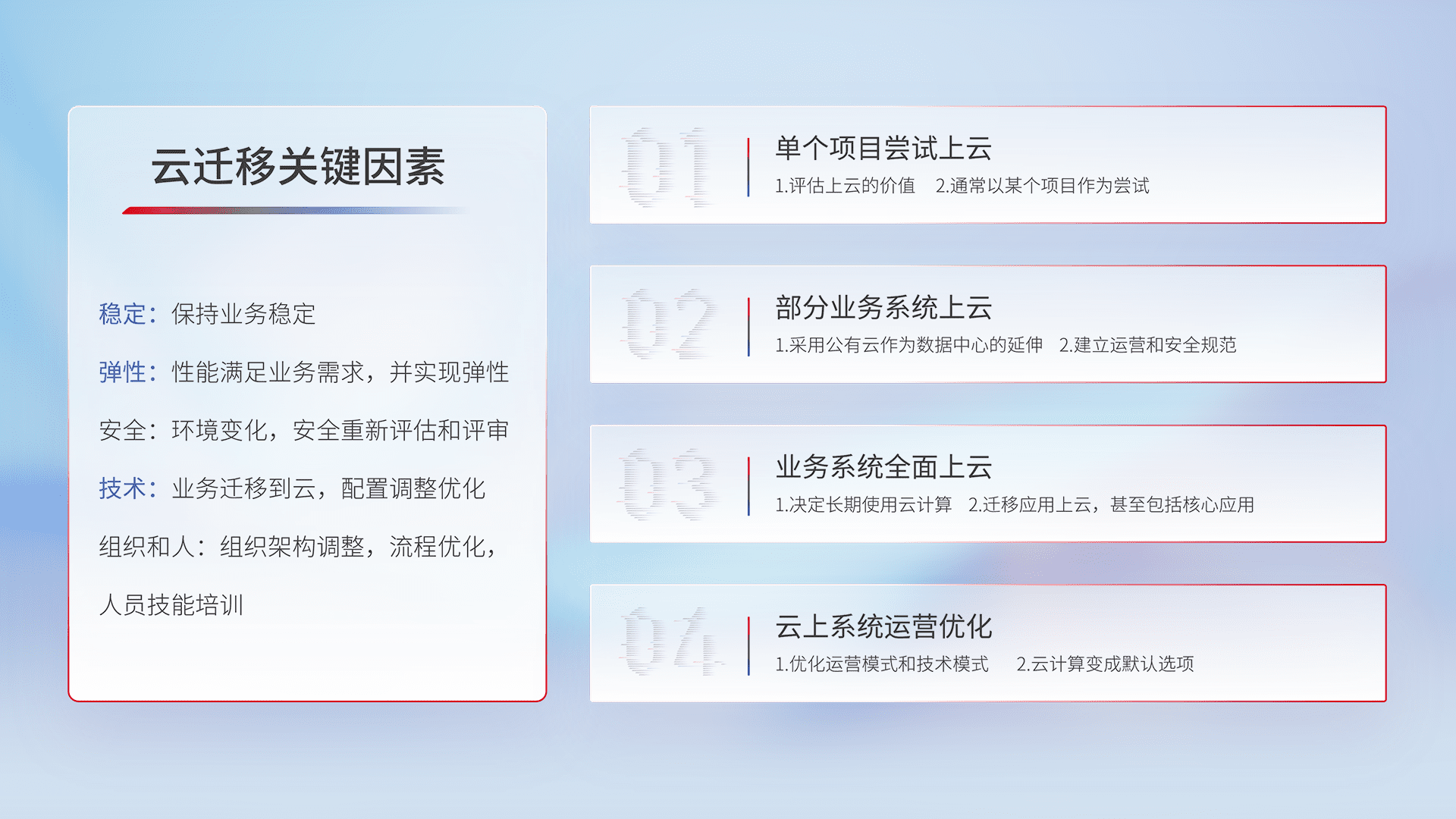 结合实际业务,,,,从规划设计、、云平台选型、、、、云原生改造、、、、数据迁移、、集成交付,,迁移全过程为客户识别最佳上云路径,,,做好风险识别管理,,,,设计网络架构、、、、身份权限、、安全审计合规、、操作审计、、、、日志审计、、、、监控告警策略、、多站点容灾设计等,,,对云上基础设施进行整体规划,,提升IT治理水平,,以满足弹性、、高可用、、、、高性能的需求。。。