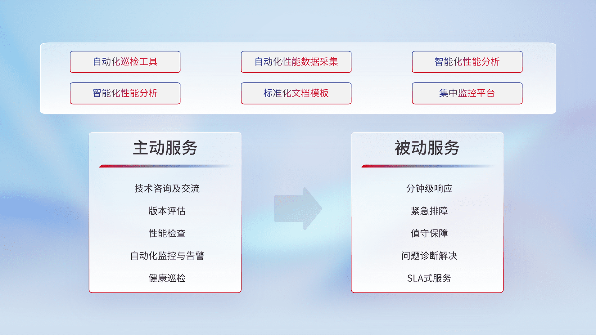 智能化工具和标准化文档,,,,保障服务质量,,提供主动服务(包含技术咨询、、版本评估、、、性能检查、、、自动化监控与告警、、、健康巡检)和被动服务包含(分钟级响应、、、紧急排障、、、值守保障、、、问题诊断解决、、SLA服务)。。。。